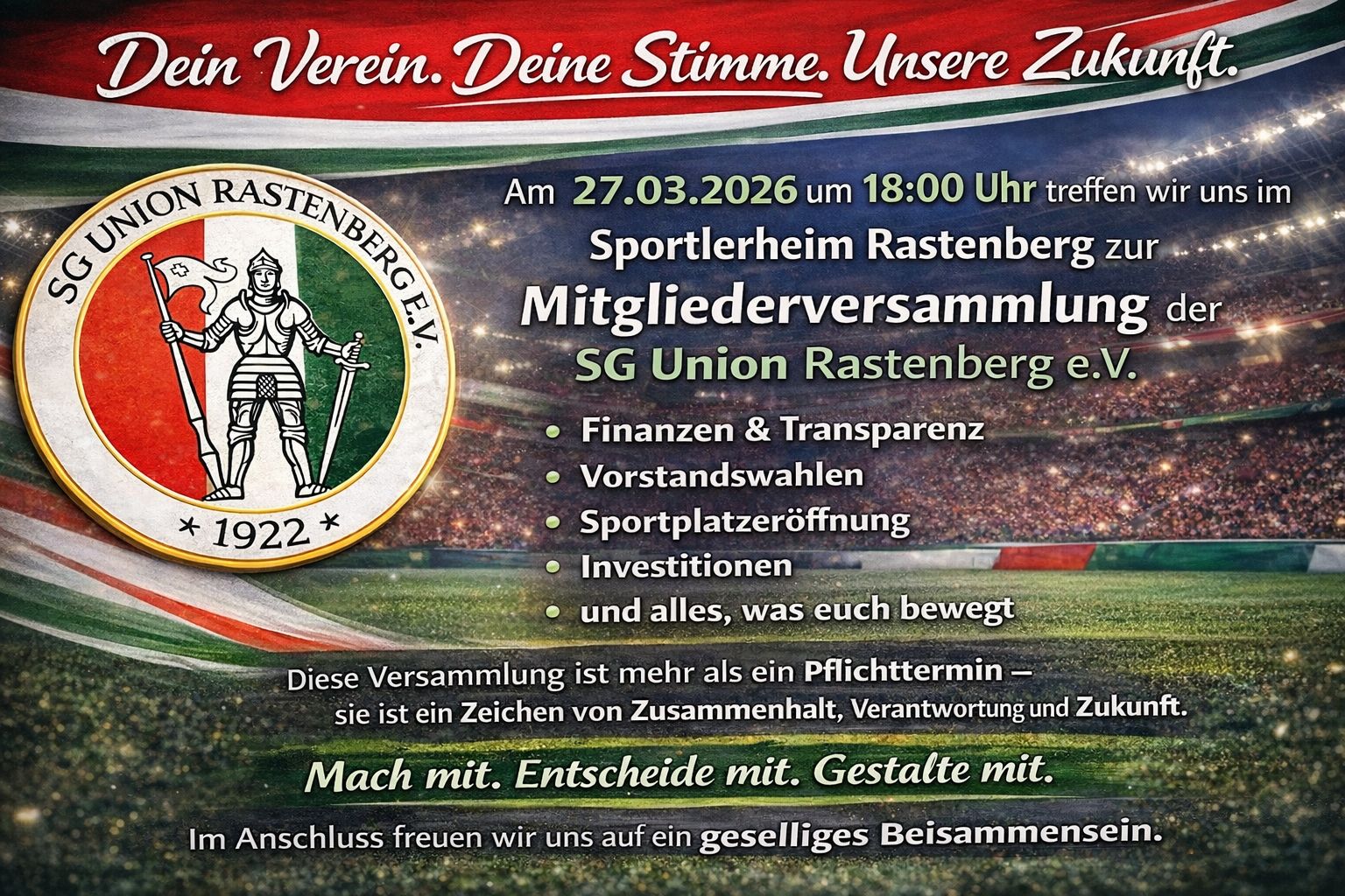 Mitgliederversammlung der SG Union Rastenberg am 27.03.2026 um 18:00 Uhr im Sportlerheim – jetzt mitgestalten!